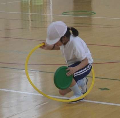 紅白のチームに分かれて、障害物リレーを行いました。子どもたちはバトンを受け取ると、一生懸命走り出し、コースにあるフラフープをくぐり、コーンを一周回り、もう一度フラフープをくぐって次の走者へとバトンをつなぎます。