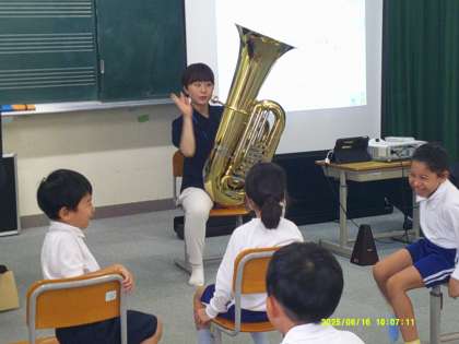 ミッキーマウスマーチでも使われているチューバという楽器の実物を見せてもらったり、音を聞かせてもらったりしました。楽器のあまりの大きさに、みんなびっくり。興味津々でした。