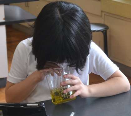加熱すると、液の中に溶けていた二酸化炭素が放出されます。その結果、酸性の状態が弱まり、BTB水溶液は元の中性または弱アルカリ性に戻り、再び緑色または青色へと変化します。