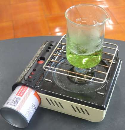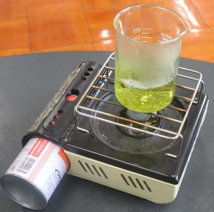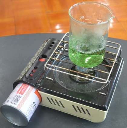 加熱すると、液の中に溶けていた二酸化炭素が放出されます。その結果、酸性の状態が弱まり、BTB水溶液は元の中性または弱アルカリ性に戻り、再び緑色または青色へと変化します。