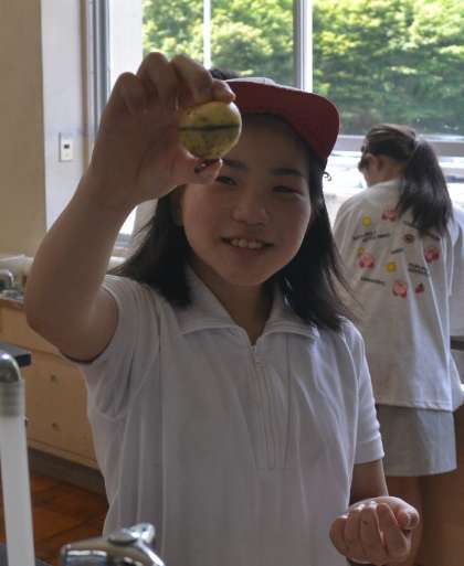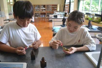 6年生が収穫したジャガイモの中から、自ら選んだ“最も小さな一個”を手にした子どもたち。その小さなジャガイモを材料に、理科の学習で学んだ「でんぷんの有無を調べる実験」を行いました。