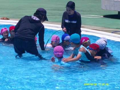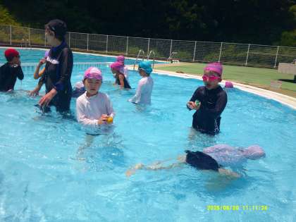 水に慣れたところで、宝探しゲームをしました。水中に沈んだ宝物を見つけるゲームです。水に潜れる子はたくさん見つけることができますが、潜れない子は手探りで探すしかありません。見つけられる数に差が出ます。