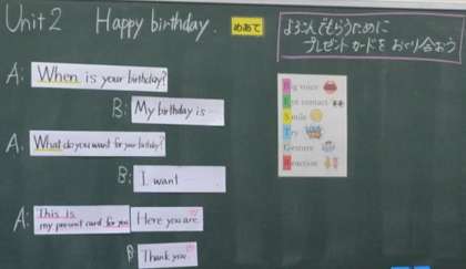 授業では、ALTの先生のサポートをたくさん受けながら、「When is your birthday?」「What do you want for your birthday?」といった会話表現を練習しつつ、それぞれが相手を思いやる気持ちを込めた英語のカードを作成しました。