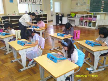 音声入力を使ったり、調べた内容を音声で聞いて理解しようとしたり、自分に合った使い方で調べ学習を進めています。そのようにして調べたことを、写真を載せたり、感想を書き込んだりしてまとめています。全員が集中して取り組んでいました。