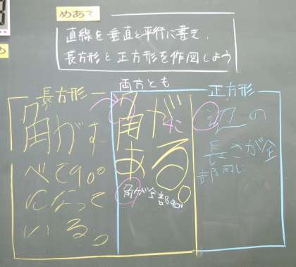 4年生の算数の授業では、「直線を垂直と平行に書き、長方形と正方形を作図しよう」という課題に取り組みました。子どもたちは、まず自分の考えをもとに図をかきながら、どのようにすれば角がすべて90度になるのか、辺の長さが等しくなるのかを試行錯誤していました。