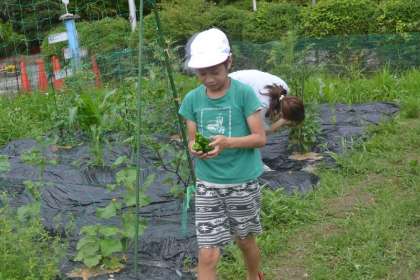 ピーマンを手にして「こんなに大きくなるなんてすごい」と、収穫の喜びとともに、植物の成長を実感している子どもの様子が伝わってきました。