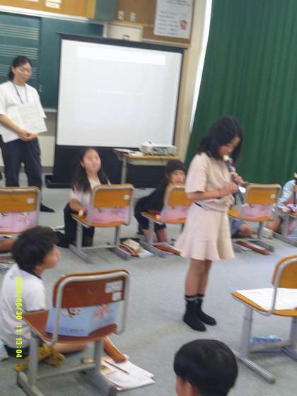 リコーダーではいくつかの短い曲を全員で吹いた後、「かっこう」「聖者の行進」の練習をしました。3年生はリコーダーを始めて間もないですが、一生懸命練習しています。4年生は流石に上手に吹けています。教師の「一人で吹ける人は?」の声掛けにも何人も手が挙がりました。ちょっぴり緊張する中、一人で演奏しました。素晴らしい演奏に、拍手が起きました。