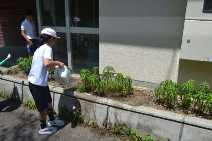 5年生の理科では、「植物の発芽と成長」の学習の一環として、トウモロコシ、インゲンマメ、そしてホウセンカの種をまき、苗を育てて、畑への植え替えを行い、大切に育ててきました。