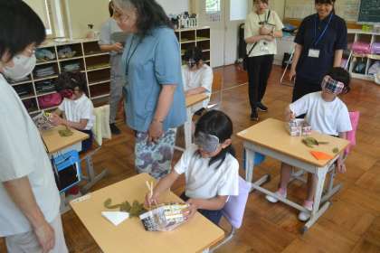 子どもたちはアイマスクを着けたまま、折り紙を折ったり、箸でモノをつかんだりと、目が見えない状況での生活の難しさや工夫を体感しました。「いつものようにできない…」「手の感覚だけで形をつくるのって難しい!」と戸惑いながらも、友だちと声をかけ合いながら真剣に取り組む姿が印象的でした。