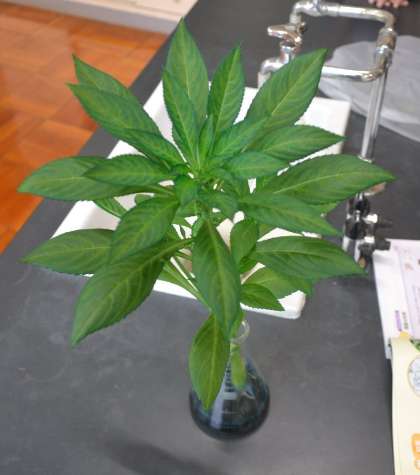 まずは、ホウセンカの茎を青い水に浸し、どのように水が植物の中を通っていくかを観察しました。「あ!茎が青くなってる!」「葉っぱまで青がいってる!」と、吸い上げられた水の色の変化に歓声が上がりました。水が道管を通って移動していることを、目で見て確かめることができ、教室が感動で包まれました。
