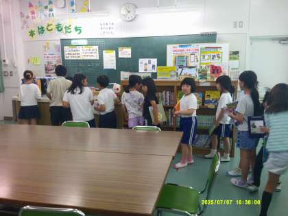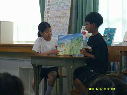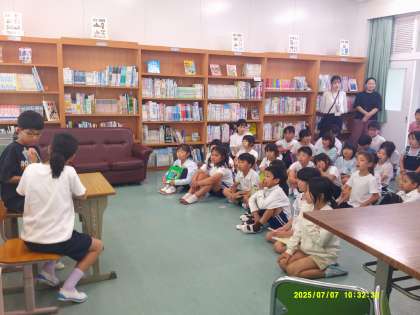 のびのびタイムに、図書委員による読み聞かせがありました。全校の児童が集まって、楽しそうに読み聞かせを聞いていました。図書委員の子は、七夕に因んだ絵本を、緊張しながらも上手に読み聞かせをしてくれました。