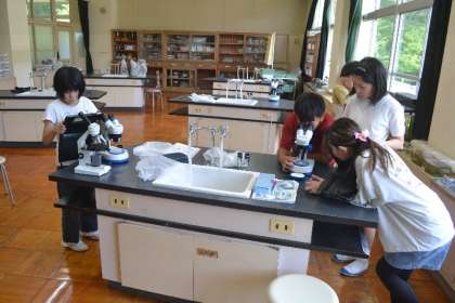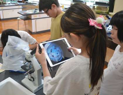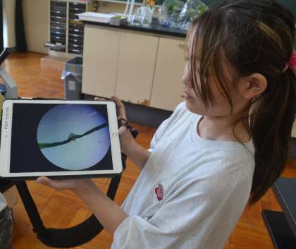 その後、双眼実体顕微鏡や光学顕微鏡を使って、植物の細かな構造にじっくりとピントを合わせ、集中して観察。吸水のしくみが見える瞬間には、思わず「わあ!」と声があがるほどの感動が広がりました。
