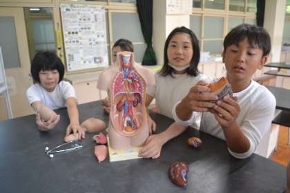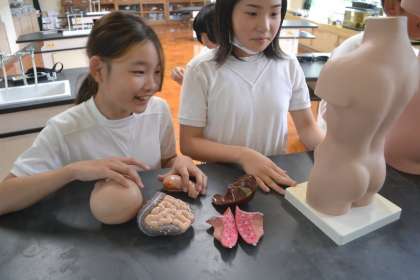 🧠学びの後半では、人体模型を活用して臓器の配置を確認。生徒たちは模型の心臓や肺、肝臓、胃などの臓器を手に取り、互いに位置や特徴を話し合いながら臓器の役割に関心を深めていきました。「小腸ってこんなに長いんだ!」「肺は左右で形が違うんだね」といった発見が飛び交いました。