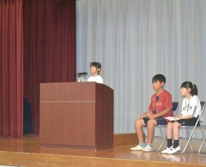 体育館に全校児童が一堂に会し、全校集会が始まりました。まず、6年生、4年生、2年生の代表児童が、立派なスピーチを披露しました。
