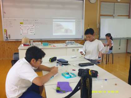 家庭科の授業では、5年生が「手ぬい見習いの卒業制作」に取り組みました。ホワイトボードには「ひと針に心をこめて」というめあてが掲げられ、子どもたちはその言葉どおり、集中して針と糸を動かしていました。