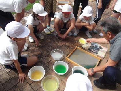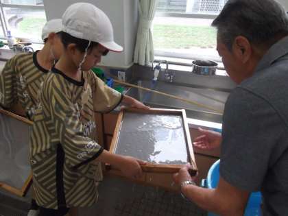9月18日から、4年生が和紙作品制作に取り組み始めました。講師の先生から、和紙づくりの歴史や工程について丁寧な説明を受けた子どもたちは、興味津々の様子。先生の熱心な指導に応えるように、子どもたちの目は真剣そのものでした。