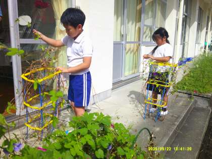 作業の合間には、黒く熟した朝顔の種を拾い集める姿も。来年入学してくる1年生へのプレゼントにしようと、優しい気持ちが自然と芽生えていました。