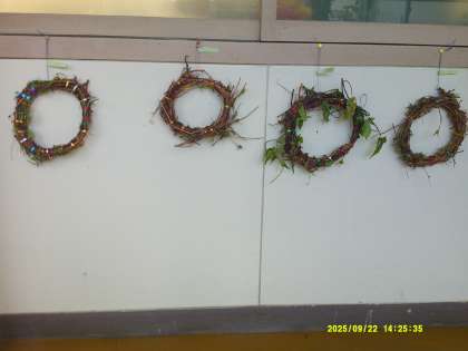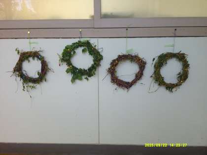 完成したリースは、廊下の壁に吊るして乾燥中です。これから冬に向けて、クリスマスリースとして飾り付けをする予定です。春から育てた命が、季節を越えて新たな形に生まれ変わる——そんな素敵な循環を、子どもたち自身の手で紡いでいます。