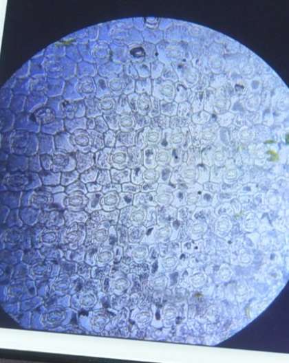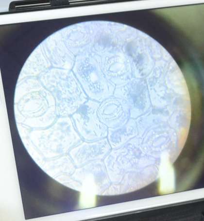 まず、ツユクサの葉の裏側の表皮を丁寧にはがしてプレパラートを作り、顕微鏡で気孔の様子を観察しました。小さな穴のような気孔が並ぶ様子に、子どもたちは「こんなふうになっているんだ!」と驚きの声をあげていました。