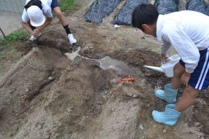 土の上に水を流すと、勢いよく削られていく地面。子どもたちは「これが浸食か!」と驚きの声を上げながら、目の前で起こる変化をじっくり観察していました。流された土が別の場所に運ばれ、やがて積もっていく様子から、「運搬」「堆積」という言葉の意味を、実感をもって理解していきました。