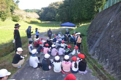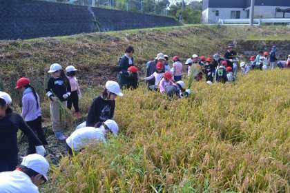 9月30日、天候にも恵まれた中、小原中部小学校の全校児童が、学校近くの田んぼで稲刈りを体験しました。黄金色に実った稲を前に、子どもたちは目を輝かせながら、鎌を手に一株ずつ丁寧に刈り取りました。
