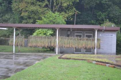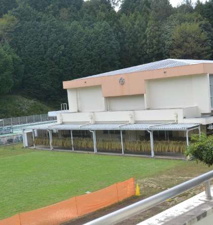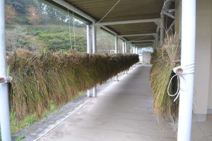 体育館まわりの屋根のあるスペースにて「はざかけ」をしています。地域の協力者のご尽力で、稲の向きや間隔に気を配りながら、ていねいに作業を進めていただきました。昔ながらの方法で、束ねた稲を竹の棒にかけて干すことで、太陽と風の力を借りてじっくりと乾燥させます。