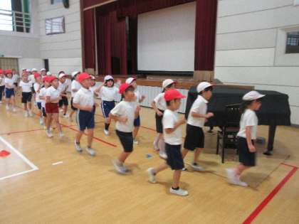 運動会に向けて、全校児童による玉入れの練習が行われました。体育館に集まった子どもたちは、赤白それぞれのチームに分かれ、かけ声を合わせながら全力で玉を投げ入れました。