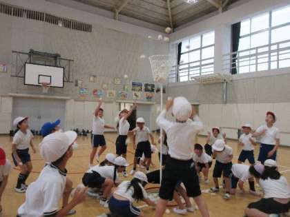 「せーのっ!」「もっと高く!」と、仲間と声をかけ合いながら、かごをめがけて何度もチャレンジ。玉が空中を舞うたびに、歓声と笑顔が広がり、体育館は熱気に包まれました。高く掲げられたかごに届くよう、投げ方を工夫したり、タイミングを合わせたりと、作戦を立てる姿も見られました。