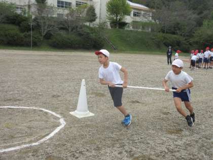 運動会に向けて、4〜6年生が「台風の目」の練習に取り組んでいます。2人1組で長いバーを持ち、右回り・左回りのコースを息を合わせて走るこの競技は、スピード調整やジャンプのタイミング、バーの高さなど、意外と難しいポイントがたくさんあります。