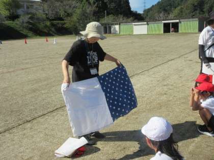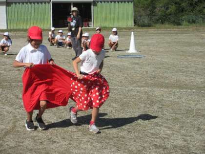 運動会に向けて、1〜3年生が「デカパンリレー」の練習に取り組んでいます。2人1組で大きなパンツをはいて走るこの競技は、息を合わせることが何より大切!