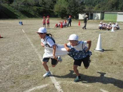 3年生がお手本を見せてくれたあと、1・2年生も挑戦。ペアで声を掛け合いながら、走るスピードを合わせたり、ズボンを素早く脱いだりと、工夫しながら練習を重ねました。