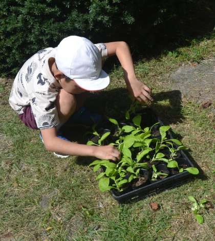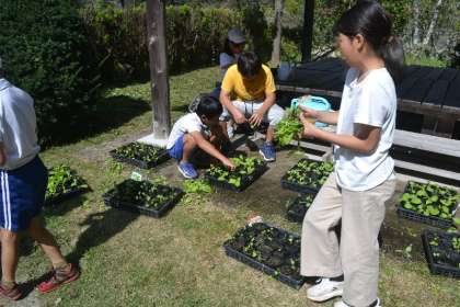 育苗ポットにまいた種が少しずつ芽を出し始めると、子どもたちは発芽の様子をじっくり観察し、間引きや水やりをていねいに行っていました。小さな芽にそっと声をかけるような姿からは、野菜への愛情と、全校への思いやりが感じられます。