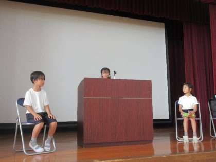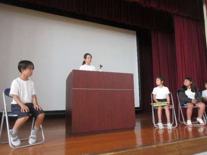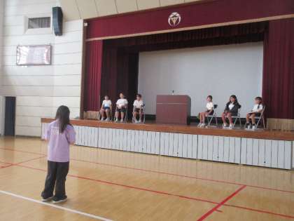 のびのびタイムの時間を活用して、翌日の前期終業式でスピーチを担当する子どもたちが体育館に集まり、リハーサルを行いました。
