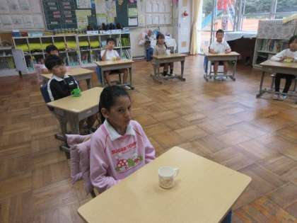 本校では、毎週月曜日に「フッ化物洗口」を実施しています。朝の落ち着いた時間、子どもたちはコップを手に、フッ化物を口に含んでしっかりうがい。静かに取り組む姿からは、健康な歯を育てようという意識が感じられます。