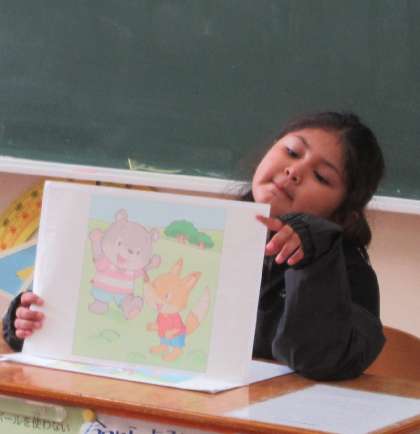 「くまさんが森で迷子になって…」「きつねが友だちを助けるために走っていった!」など、子どもたちの発想は自由でのびのび。低学年ならではのユニークな展開や、心あたたまるストーリーが次々に披露され、教室は笑顔と驚きに包まれました。