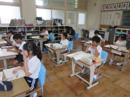 4年生は国語の授業で『一つの花』という教材に取り組みました。この物語では、お父さんが娘に花を渡す場面が印象的です。「お父さんは何輪の花を持ってきたのか?」「どうしてその中から1輪だけを渡したのか?」という問いを通して、子どもたちは文章を読み取る力だけでなく、想像する力も育んでいきました。