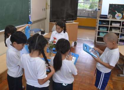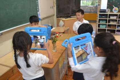 「これはジニアっていうんだって!」「この紫のは…ダルマギクかな?」と、次々に花の名前を見つけていく姿は、まるで小さな研究者。先生の思いやりに感謝しながら、テクノロジーの力を活かして学びを広げる1年生の姿に、周囲の大人たちも思わず笑顔になりました。