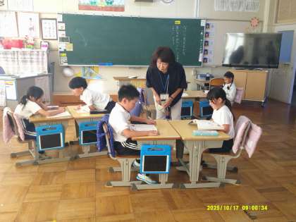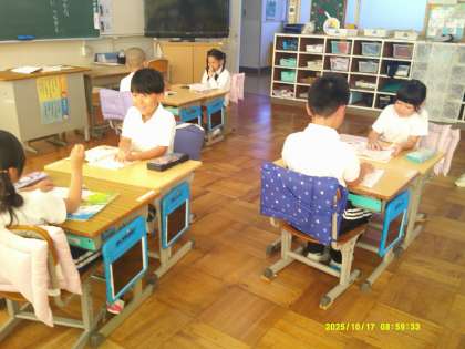 1年生の国語では、2人一組になって会話文の読み合いを行いました。相手の話に気持ちよくつながるように、どんな気持ちで話しているのかを考えながら読む練習です。