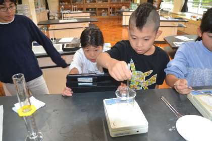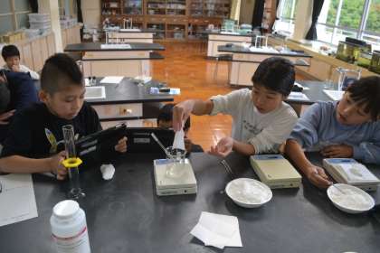 5年生が理科の授業で「ものの溶け方」についての科学研究に挑戦しました。テーマは「水50gに砂糖はどれだけ溶けるのか?」。子どもたちはインターネットで情報を調べ、およそ100gの砂糖が溶けるというデータをもとに、実験計画を立てました。