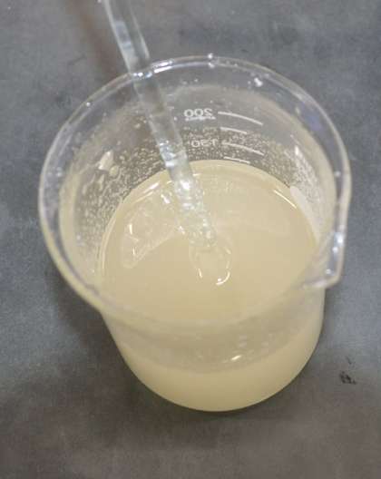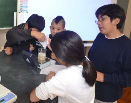 実験では、メスシリンダーを使った水の体積の測定や、電子てんびんの風袋(ふうたい)機能の使い方を瞬時に習得。6人のチームで協力しながら、5gずつ砂糖を加えていくという地道な作業を、なんと20回繰り返し、見事に100gの砂糖を溶かし切ることに成功しました。