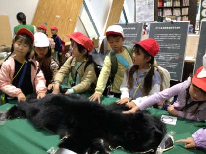 館内には、森にすむ動物たちの毛皮や骨格標本、昆虫の標本、地形や植生を示す地図など、実際に“見て・さわって・考える”ことができる具体物が数多く展示されています。子どもたちは、目の前に広がる本物の資料に興味津々。「この毛、ふわふわしてる!」「クマってこんなに大きいんだ!」と、実物にふれることで、教科書では得られないリアルな感覚を味わっていました。