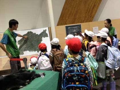 地図を使った学習では、森の地形や水の流れ、動物のすみかなどをスタッフの方が丁寧に説明してくださり、子どもたちは「ここにタヌキがいるかも!」と、自分たちの体験と照らし合わせながら理解を深めていました。
