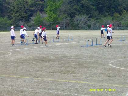 「ハードルの前で止まらないように」「上に跳ぶんじゃなくて、走るような感じで跳ぶといいよ」など、グループ内でお互いにアドバイスをし合いながら、何度も挑戦する姿が見られました。