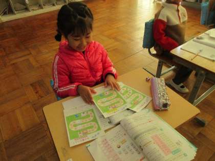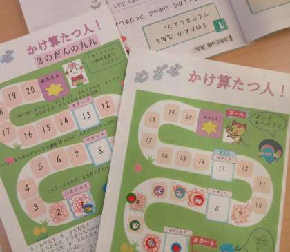 2年生の教室では、今「かけ算チャレンジ」が盛り上がっています。5の段、3の段、2の段を中心に、かけ算カードを使って楽しく練習中です。