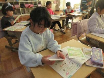 カードをめくりながら答えを言うと、シールやスタンプがもらえる仕組み。「やった!」と嬉しそうな声があがり、教室には笑顔が広がります。「家で練習してきたよ!」と意気込む子もいて、自信をもって挑戦する姿がとても頼もしいです。