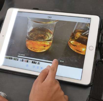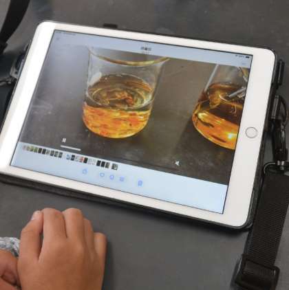 子どもたちは2つのビーカーに同じ量の水とコーヒーシュガーを入れ、一方はガラス棒でかき混ぜ、もう一方はそのまま放置。その様子を、学習用タブレットのタイムラプス機能を使って記録しました。時間の経過とともに、どちらが早く、どのように溶けていくのかを動画で確認できることで、目に見えにくい「溶ける」という現象を、より実感をもって理解することができました。