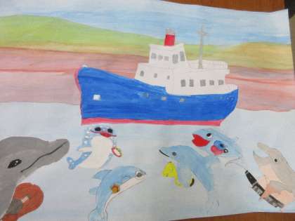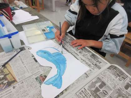 制作にあたっては、タブレットを使って資料を検索し、楽器の形や動物の動きなど、細かい部分までよく観察して描く姿が見られました。「この楽器、どこを持つの?」「イルカのひれってどう動く?」と、調べる力と表現する力を組み合わせながら、作品づくりに取り組む様子はとても頼もしく感じられます。