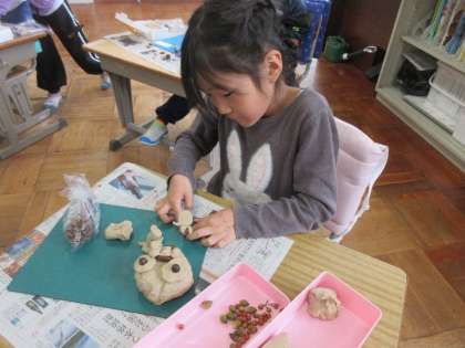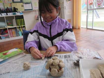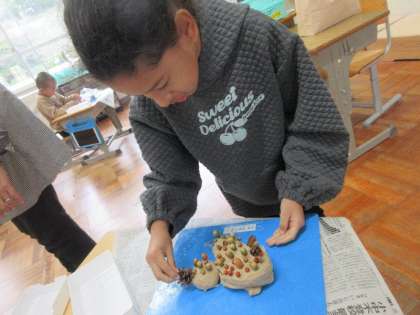 1年生の図工では、ねんどを使った「ケーキづくり」に挑戦しました。ふわふわのねんどをこねたり、丸めたり、重ねたりしながら、思い思いのケーキを形にしていきます。仕上げには、木の実を使ってデコレーション。どんぐりや豆、小さな種など、自然の素材がトッピングになって、見た目も楽しい作品が次々と生まれました。