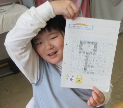今回のプリントは、答えを塗りつぶしていくと絵が浮かび上がる“お楽しみ問題”。「早く絵が見たい!」と、子どもたちは夢中になってどんどん計算を進めていました。プリントが完成すると、がんばった証としてシールをぺたり。どんなキャラクターが現れるのか、みんなワクワクしながら取り組んでいます。