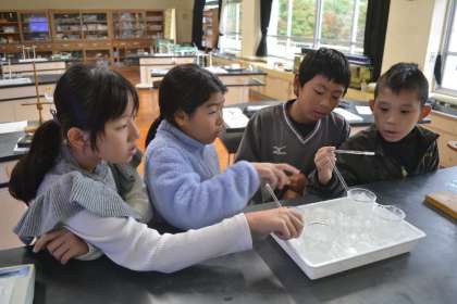 続いて、「水に溶けた物質は、冷やすとどうなるのか?」というテーマで、ミョウバン水溶液を使った実験に取り組みました。先ほど、加熱することでミョウバンがすべて溶けることを確認した子どもたち。今回は「冷やしたら、また結晶ができるんじゃない?」という予想をもとに、検証実験を行いました。